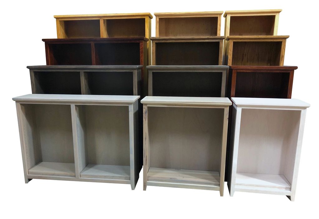 Shaker Style Bookcases. (Left to Right) Double Bookcases 48" made in Calico Birch with varied finishes. 32" made in Rustic Hickory with varied finishes. 24" made in Oak with varied finishes.